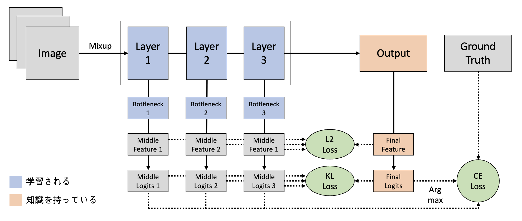 追加されたBottleneckを通じサイズが揃えたMiddle Feature(1・2・3)は、Final FeatureとのL2 Lossを求めることで知識を蒸留します。 - 最終レイヤーからのResponse-based knowledge(Logits)を中間層で学習