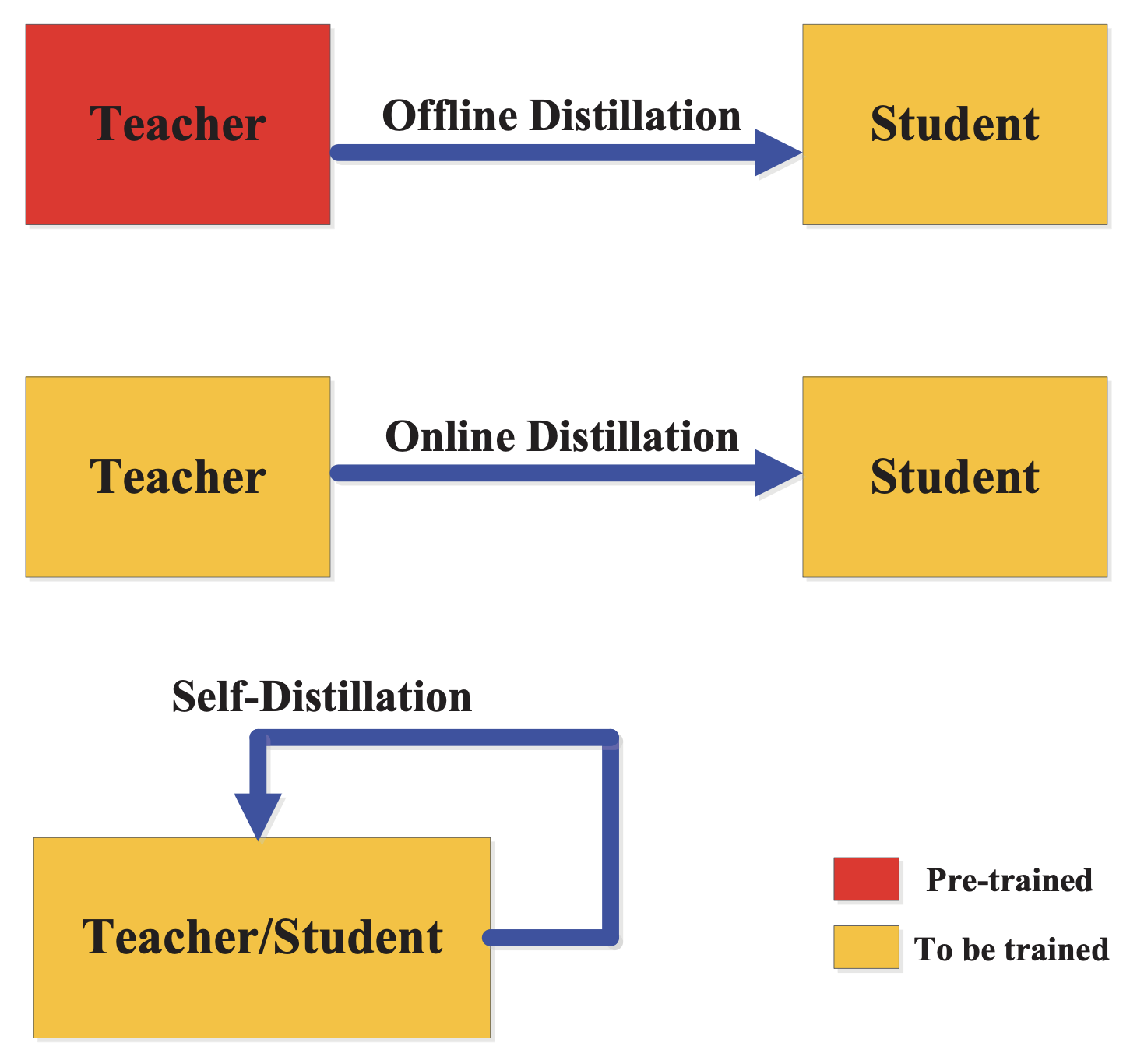 KDプロセス上、「Teacher・Studentモデルがお互いに学習を行い、知識を共有する方法」で、上の図では、学習能力のあるTeacherモデルの知識をStudentモデルに蒸留することを表しています。 この概念以外にも、Teacherモデル無しで
