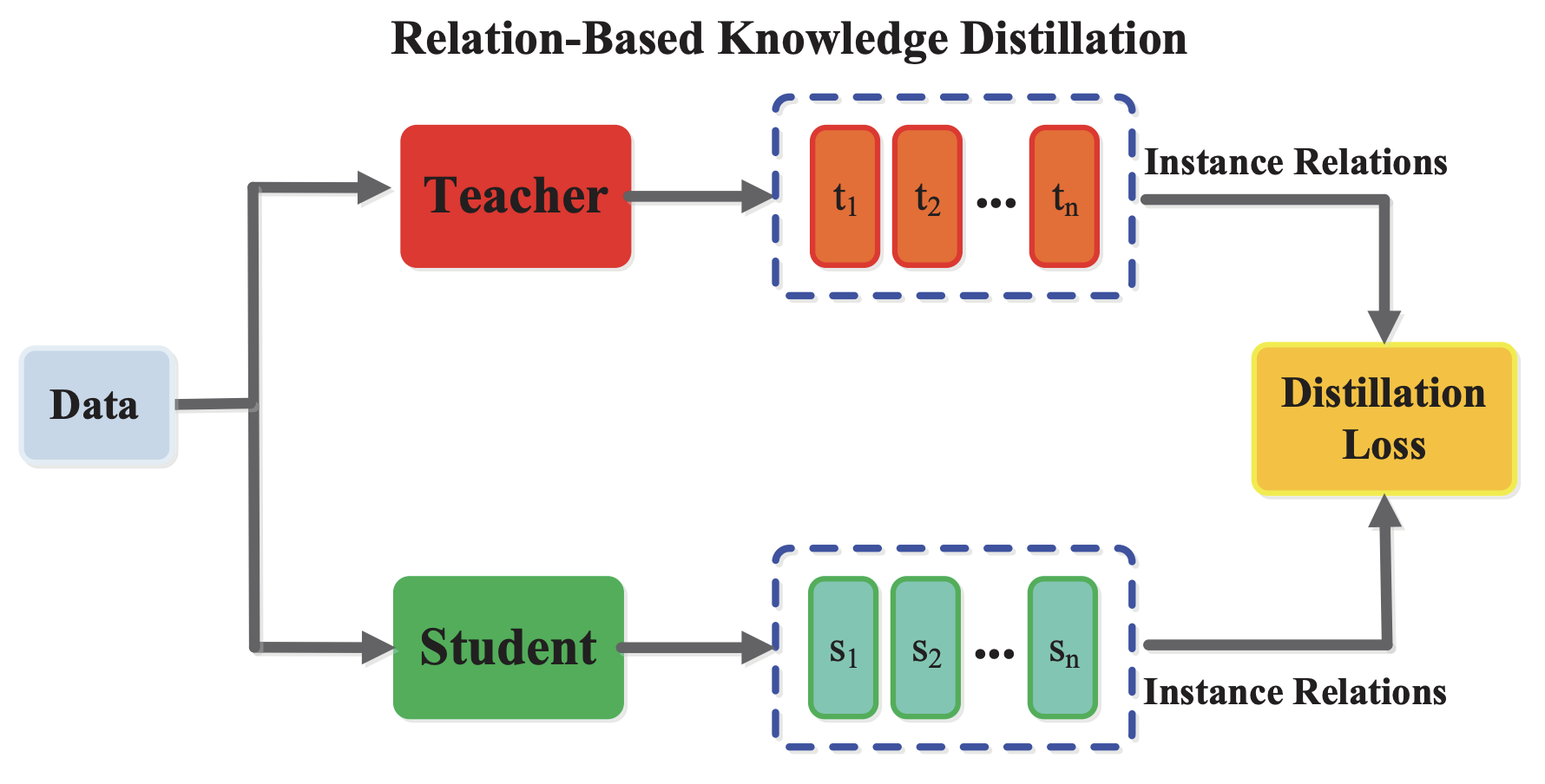 例えば、中間層出力間の距離を関係として扱い「Teacherモデルと似たような関係をStudentが学習する」ような形になります。