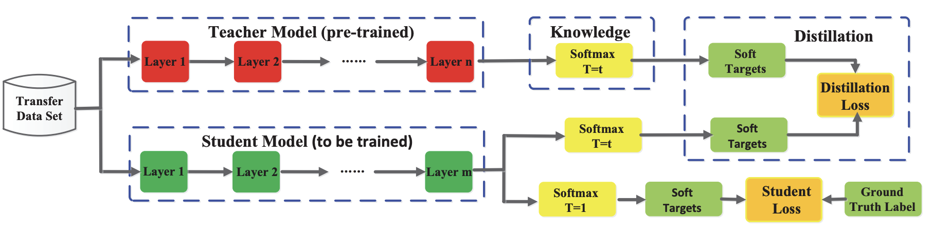 下の図で確認できるように、Teacherモデルの知識を蒸留しStudentモデルに移して「より軽くて良い精度を持つモデルを作る」のが、KDの目的だと考えられます。