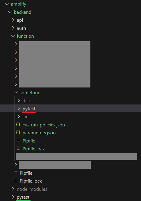 赤線と同じ階層でディレクトリ作ったら、「amplify push」の時一緒にデプロイされてしまいます。これを避けるために緑の線のようにfunction外部に単位テスト用ディレクトリ作成がお勧めです。