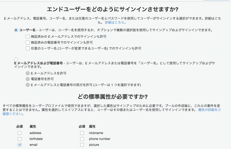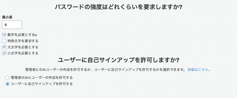 パスワードの強度や、ユーザーへのサインアップの許可の選択