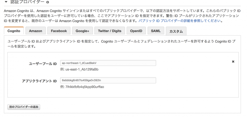 認証プロバイダーは先ほど作成したCognitoのIDを入力します。