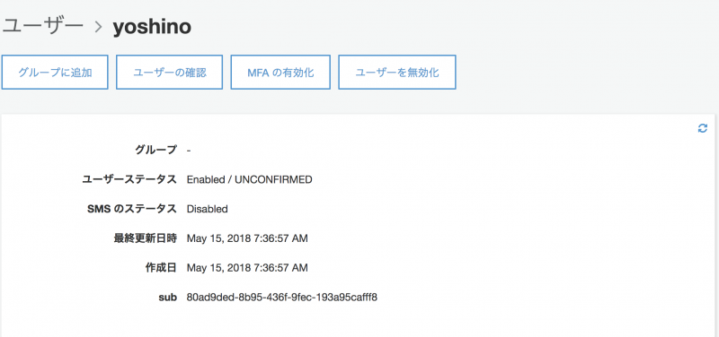 以下のようにユーザーが作成されているので、「ユーザーの確認」を押します。