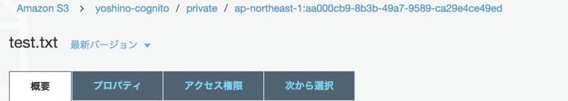 yoshino-cognitoというバケットの中の、CognitoログインしているユーザーのIDに対して、GetやPutができるような設定になっています。