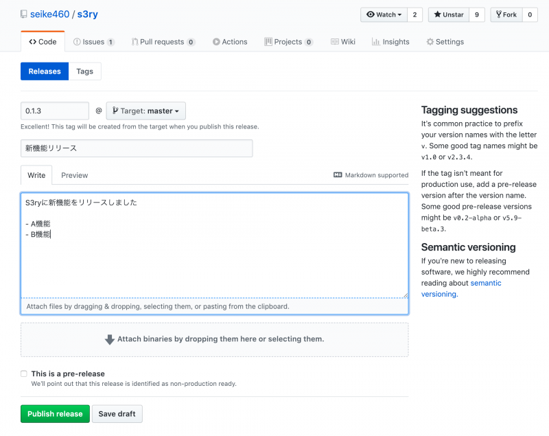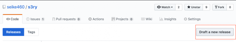 Githubのページに移動して新しいReleaseを作ります