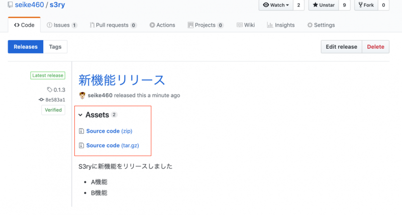 内容を入力して Publish release するとソースコードが圧縮されて配置されますが、