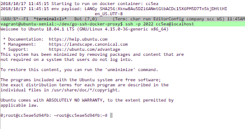 そして、起動して適当なDockerコンテナをrunしてその名前をSSHのユーザー名にしてこんな風に起動できます: