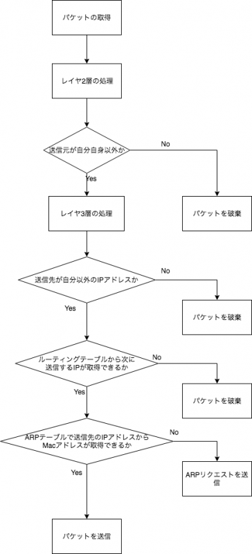 パケットを取得後は、取得したパケットのチェックサムでパケットが崩れてないか、TTLが0になっていないかなどをチェックをします。(レイヤ3層の処理なんで今回は省きます) そのあとはIPアドレスとルーティングテーブルから、ネクストホップのIPを取得します(「ルーティングテーブルから次に送信するIPが取得できるか」の部分)。 ここで取得したネクストホップのIPアドレスからMacアドレスを取得するようになります。